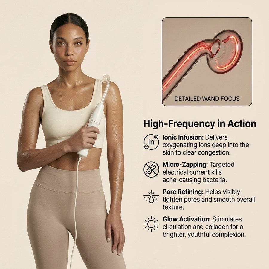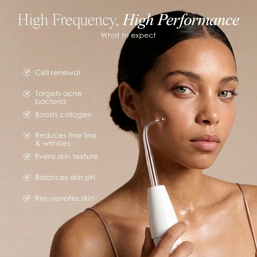 Our High Frequency Wand, targets multiple skin concerns like acne, fine lines, hyperpigmentation, texture, and redness